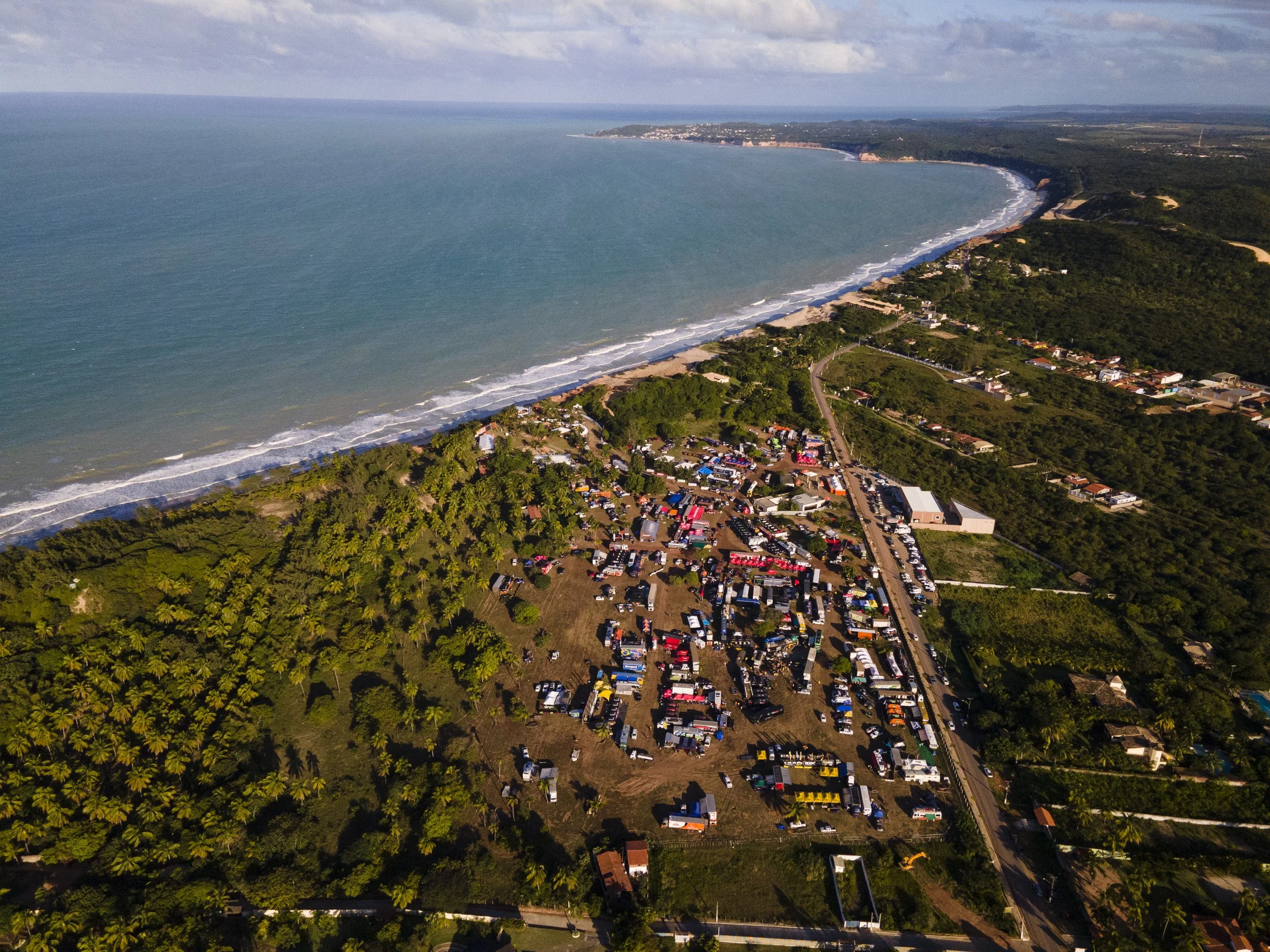 Aerial view of a beach with parked cars and tents, surrounded by green trees and residential areas along a coastal road, with the ocean and a distant shoreline.